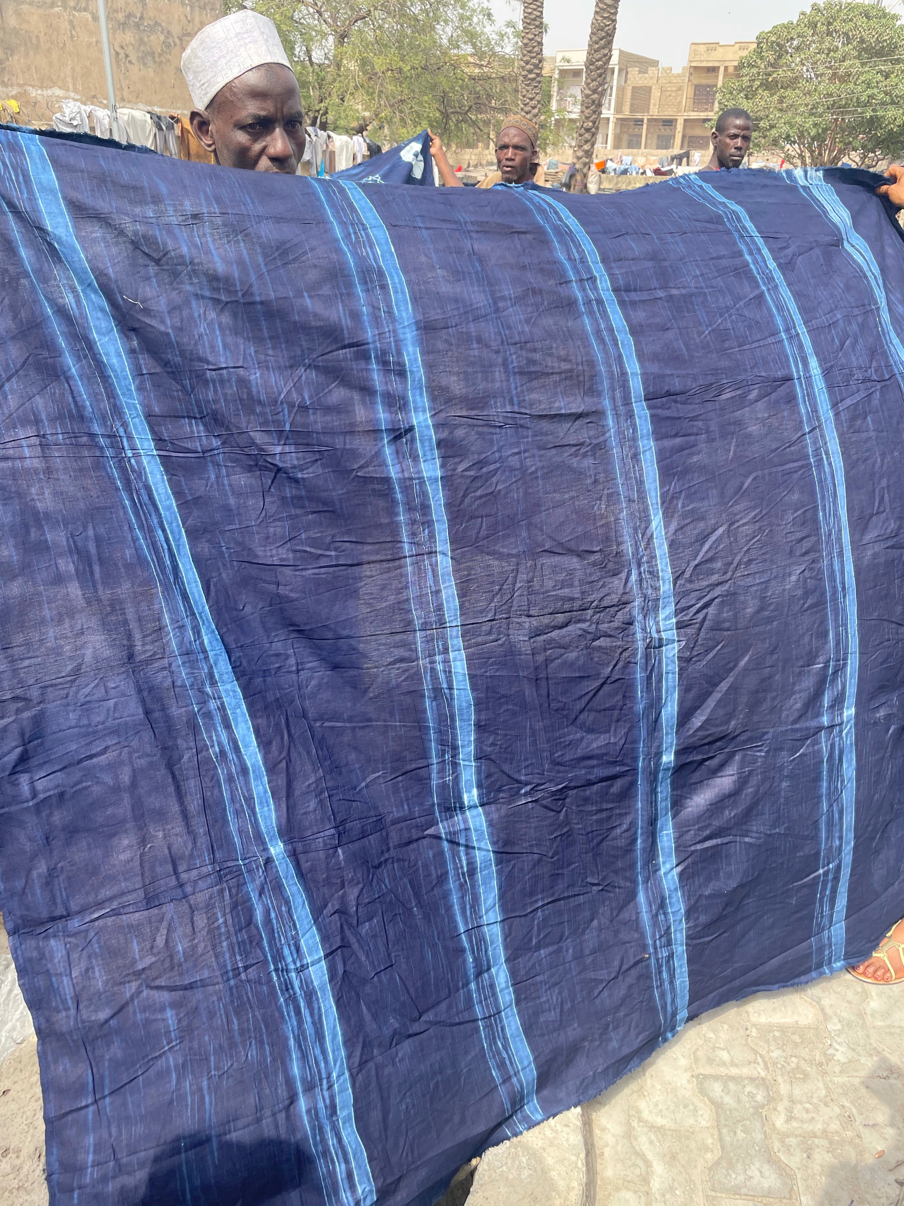 Each fabric has been naturally dyed Indigo in the Kofar Mata Dye pit. Several of the intricate designs are tied and woven by women at home, then given to the men to be dyed at the dye pits.