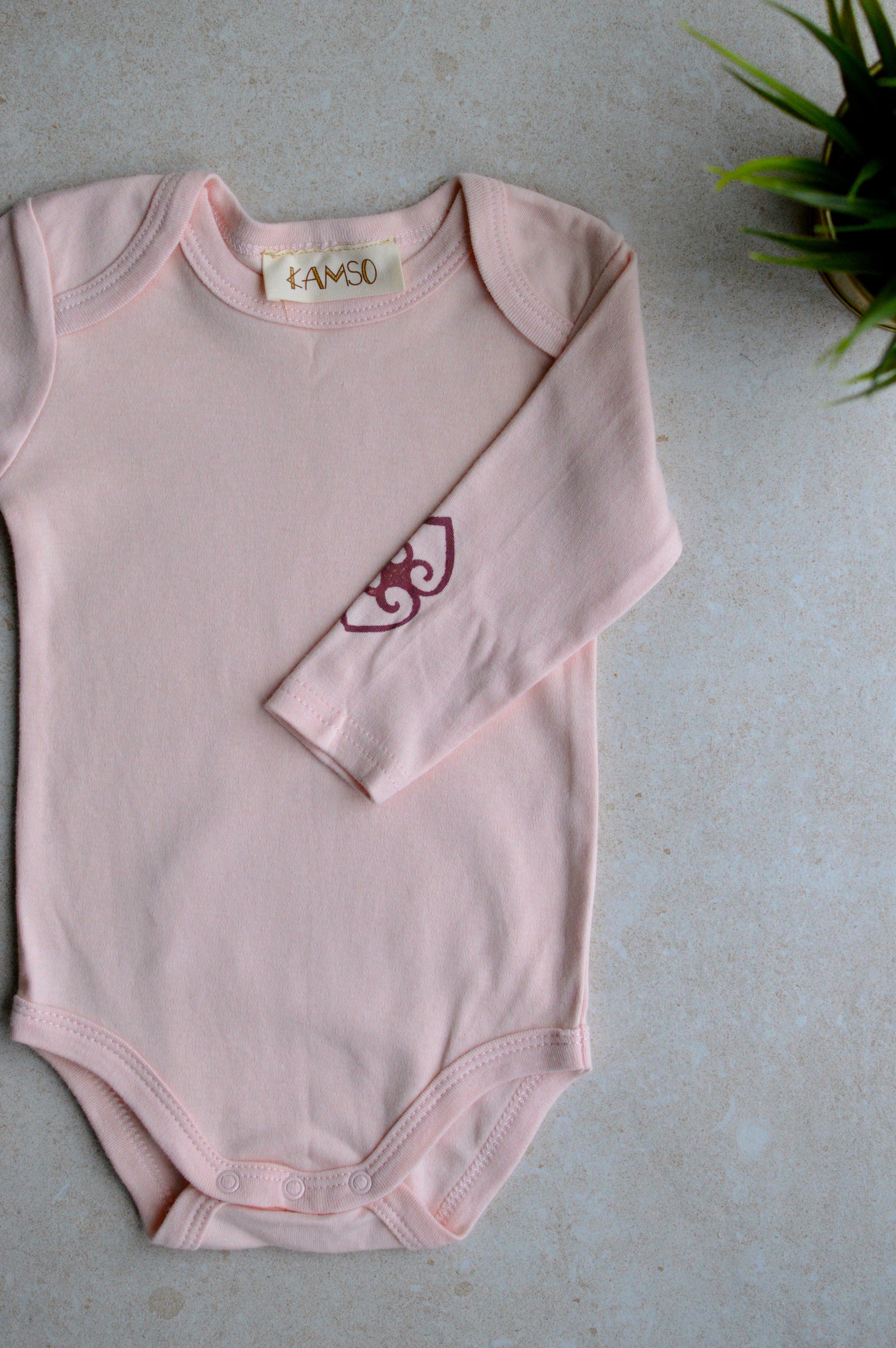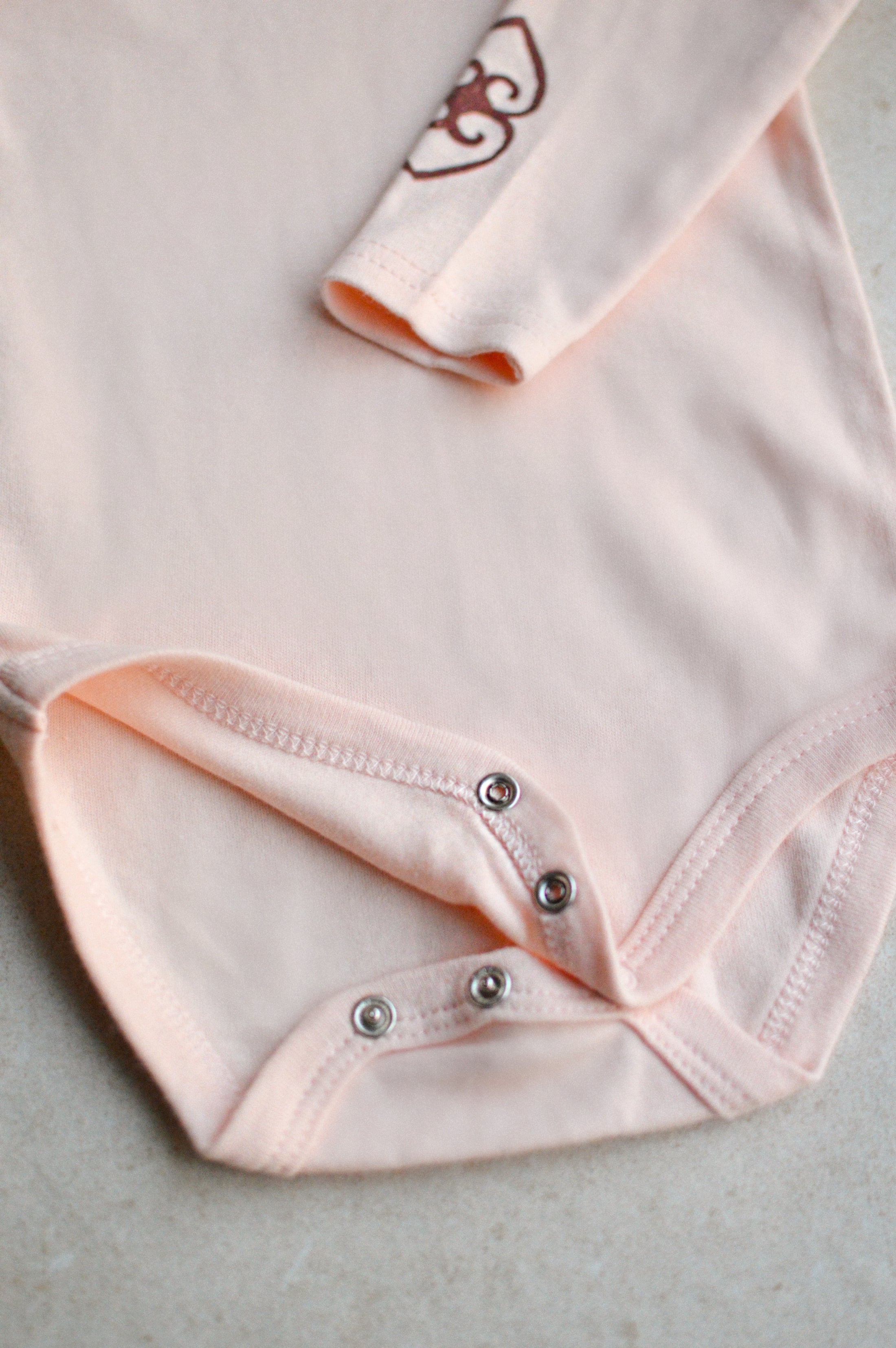 Our long sleeve bodysuit in Rosewater is incredibly soft and has been beautifully embellished with an Asase Ye Duru Symbol. The simple pop opening and envelope neckline makes for a quick and easy change.
