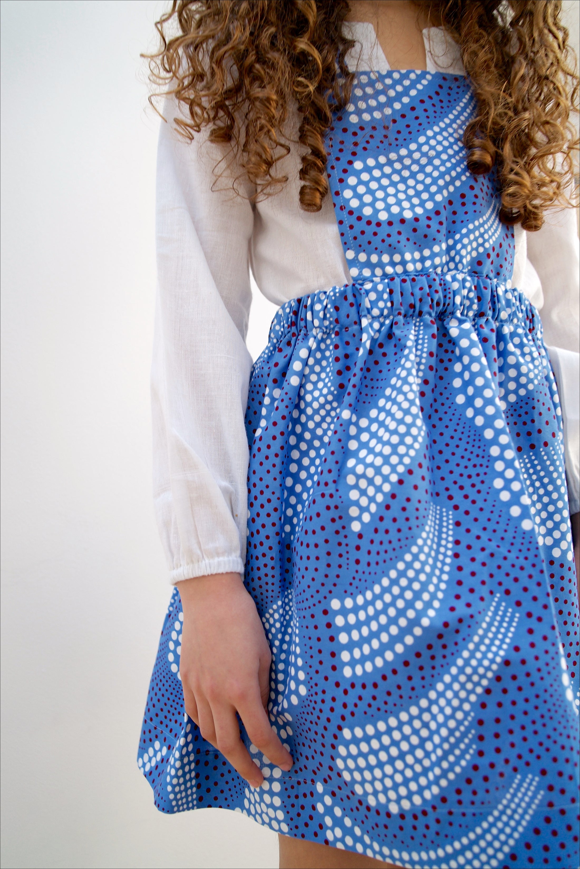 Our Blue Dot Ndidi Apron dress is made from 100% African waxed cotton.
