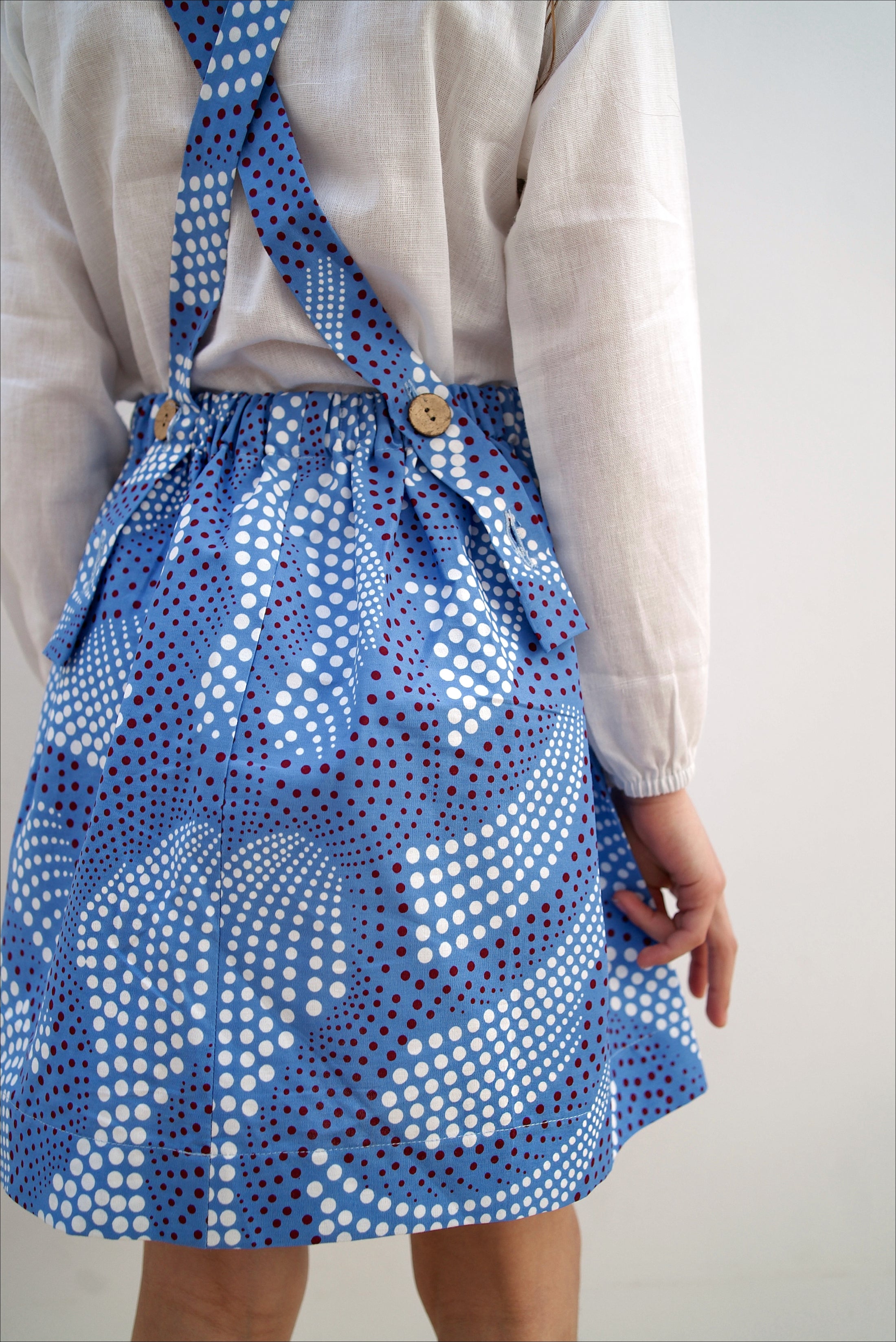 This flared dress features a beautiful African Dot print and straps that cross-over at the back and are secured with coconut buttons.