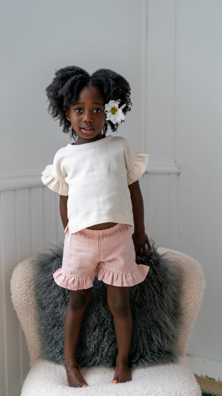 The Ama Frilled Top in Bone is an essential piece for your little one’s wardrobe. Crafted from GOTS certified Burkinabe Cotton, this fabric is hand-loomed by skilled artisans in Burkina Faso. The delicate frilled sleeves bring a subtle yet stylish touch to any outfit, while the neutral Bone color adds versatility. Perfectly paired with the matching Ama shorts or other wardrobe staples, this top is a beautiful balance of simplicity and elegance.