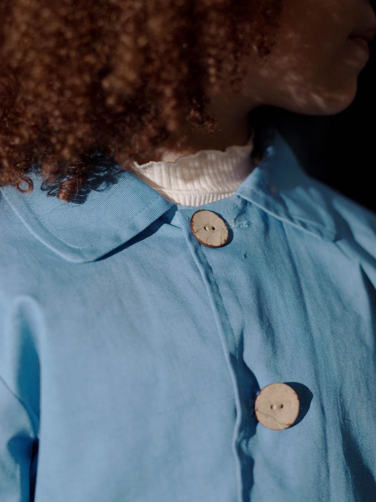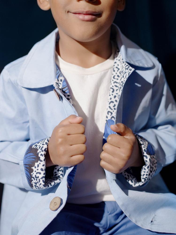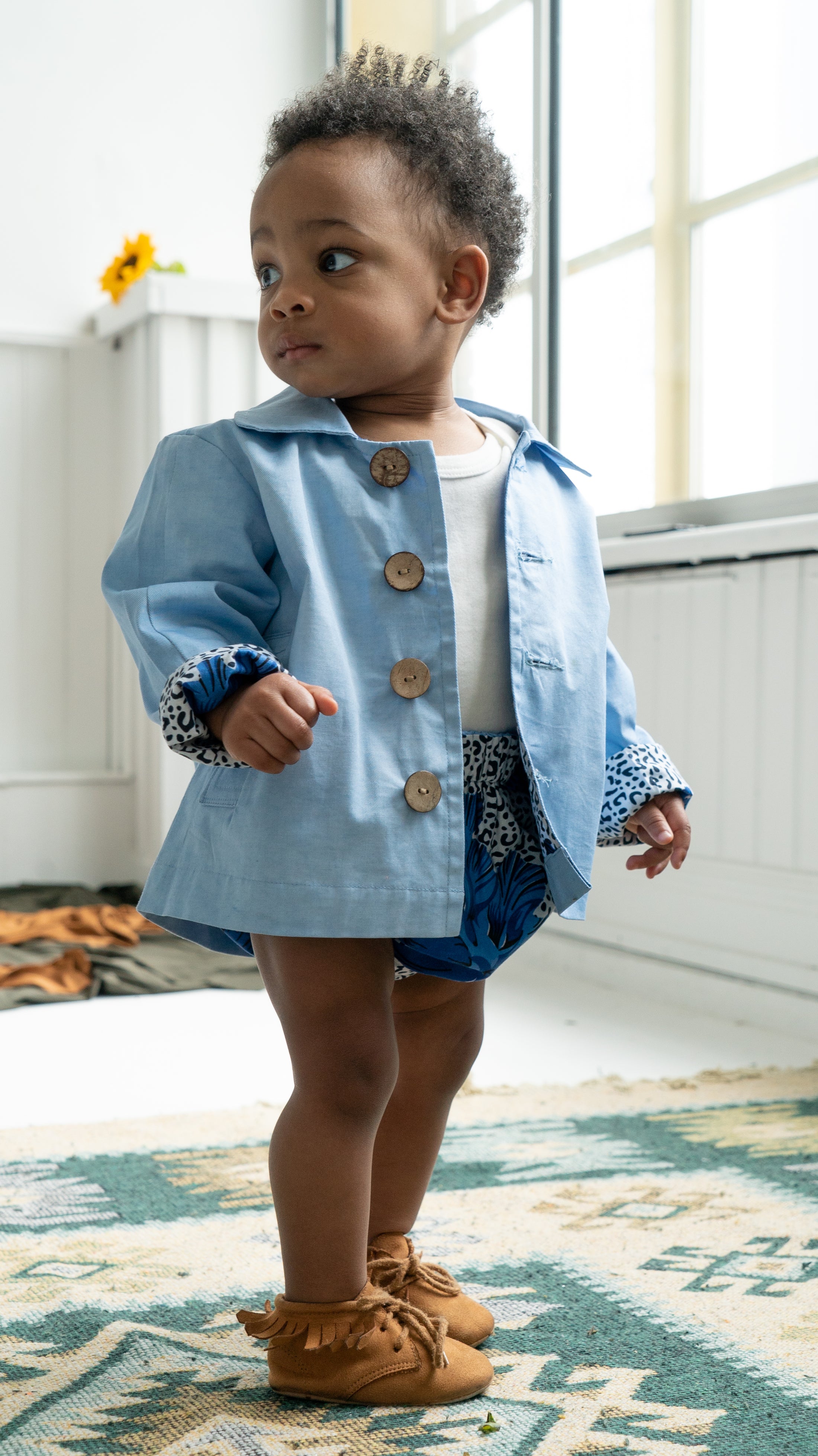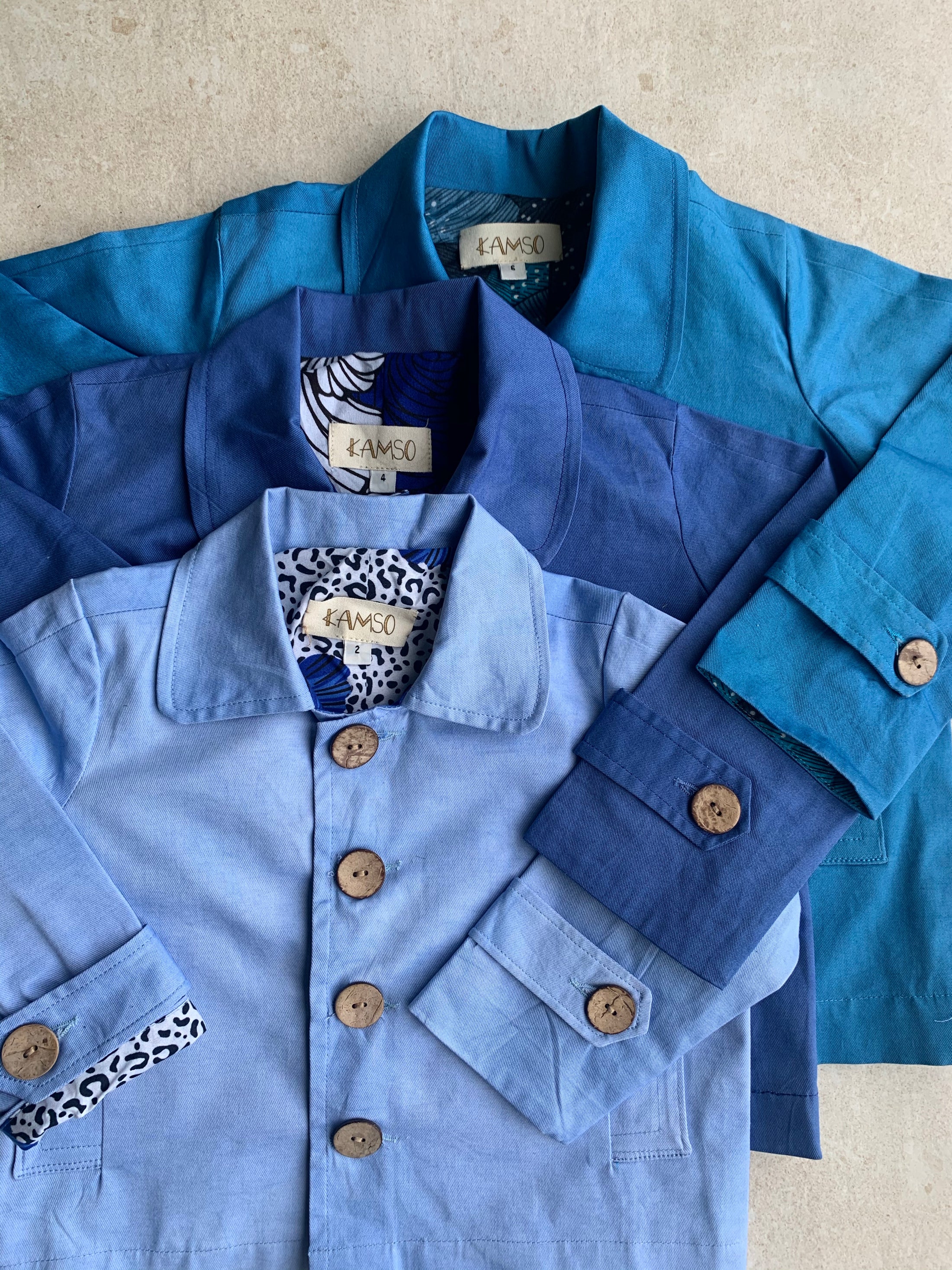 Available in 3 shades of Indigo, the jacket is constructed with a slightly boxy fit and lined with a vibrant wax printed fabric, that peaks through when the cuffs are rolled.