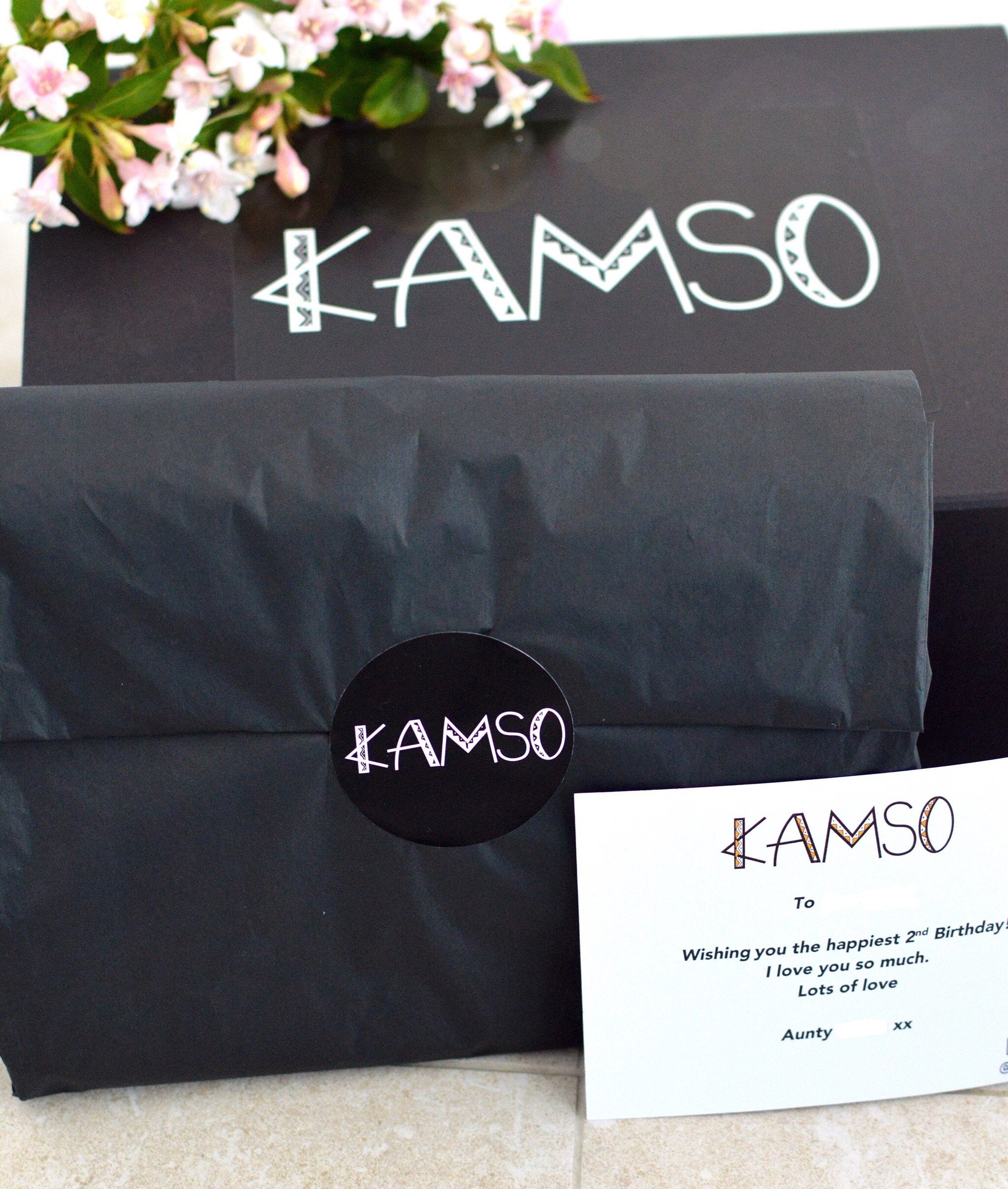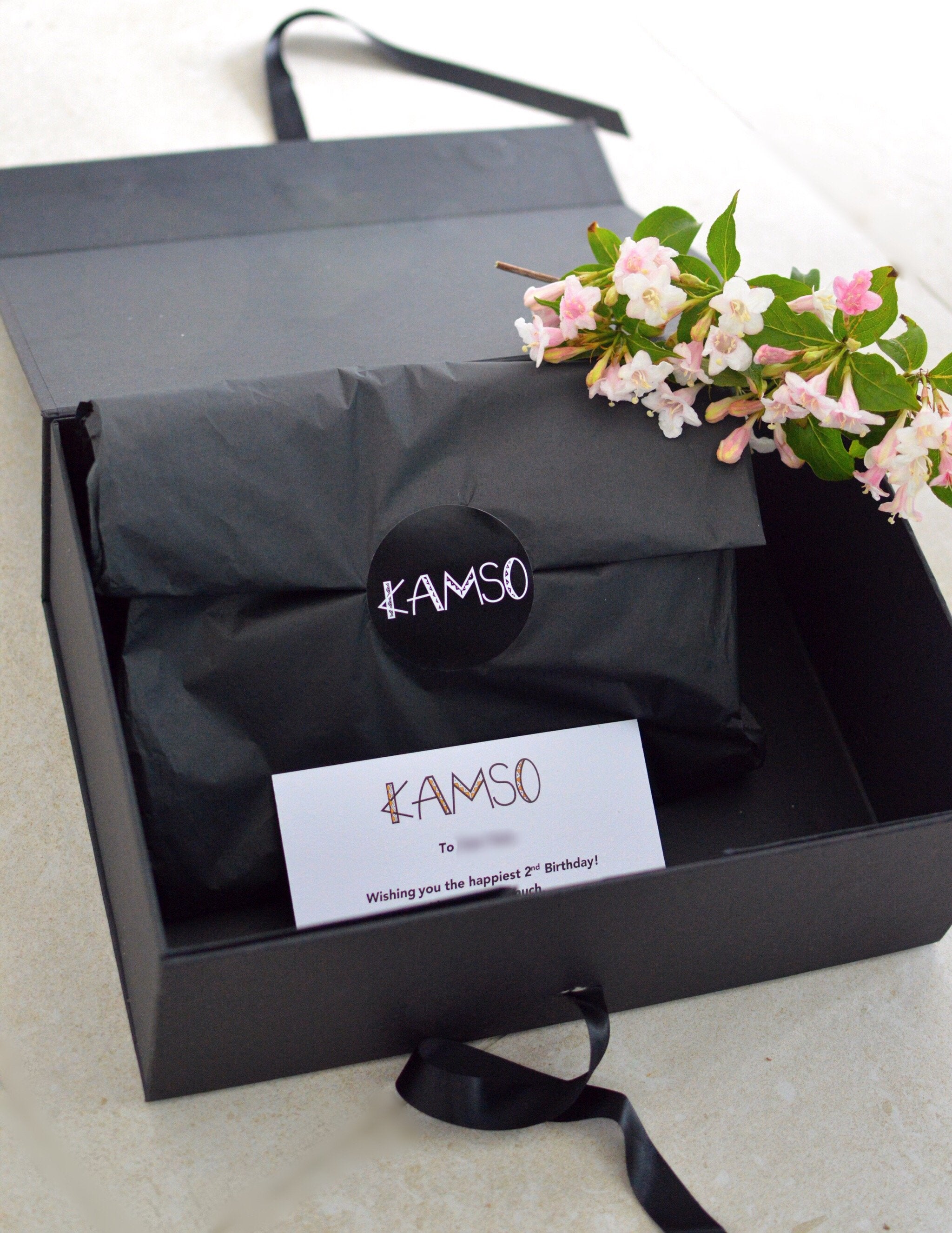 All gift items come packaged in our stylish sustainable packaging. Your items will be wrapped in black tissue paper, sealed with a Kamso sticker and packaged in a black Kamso gift box tied with a ribbon.