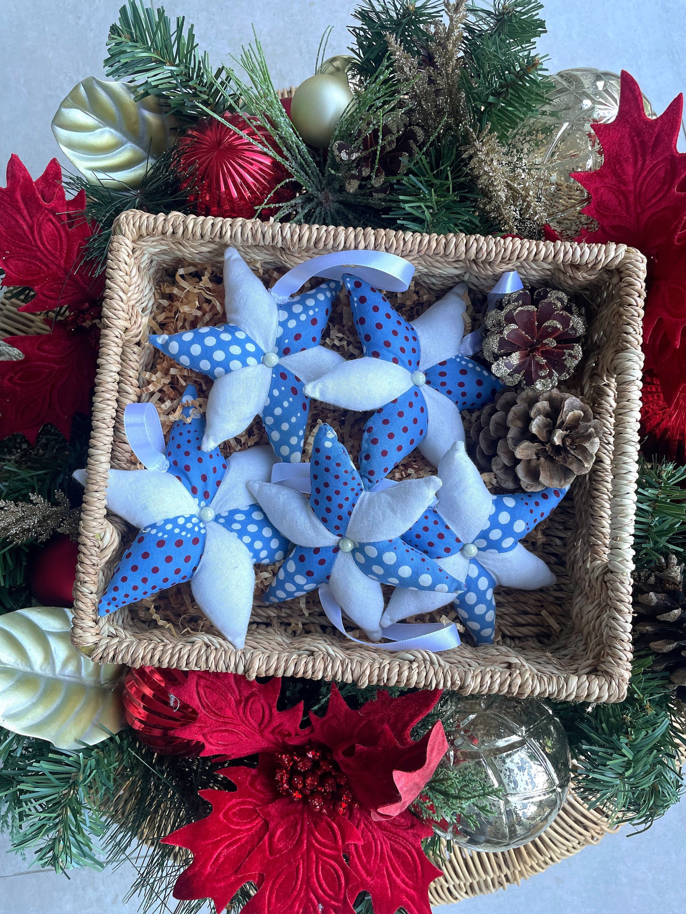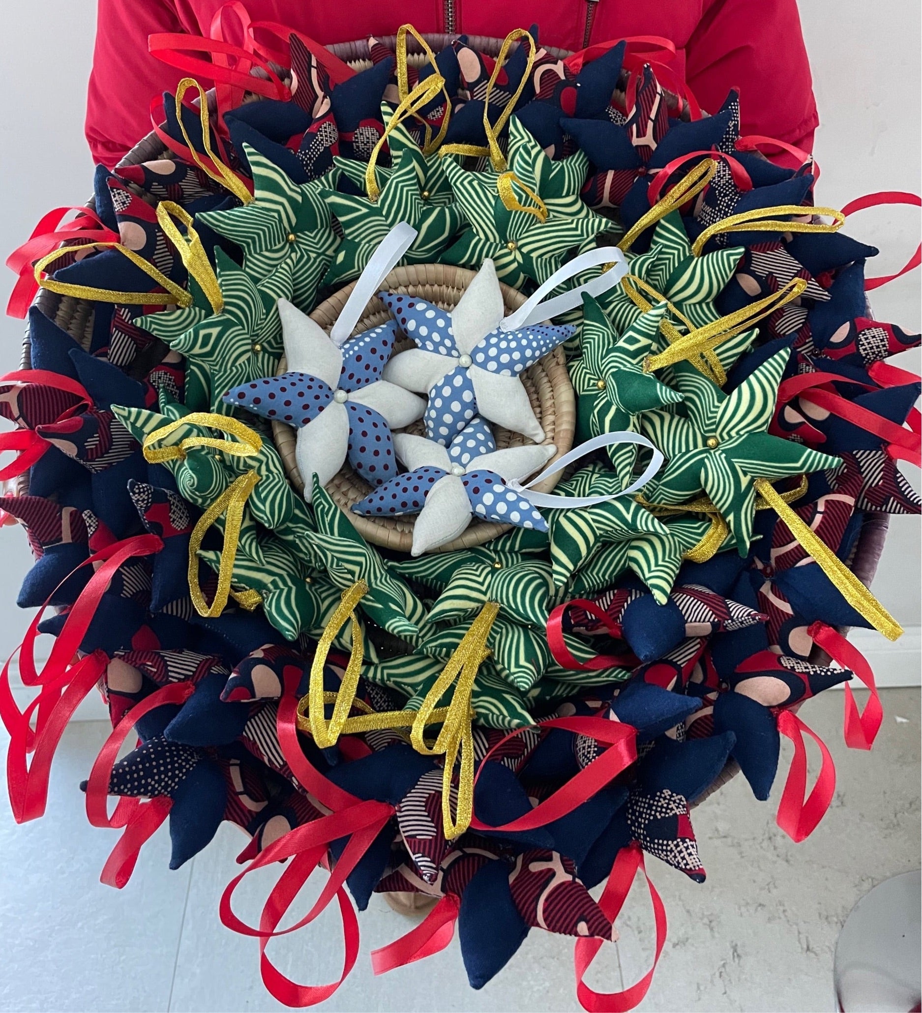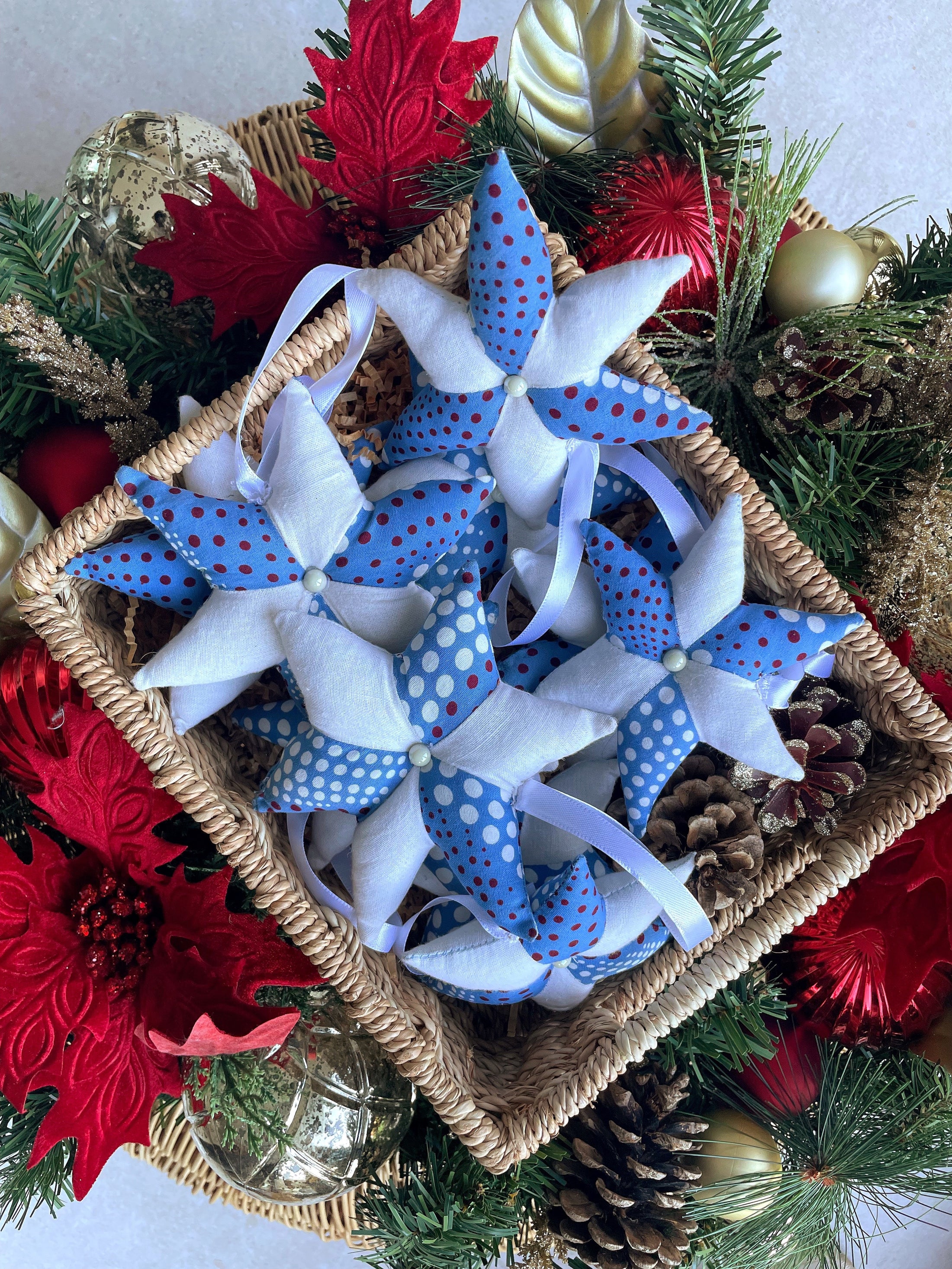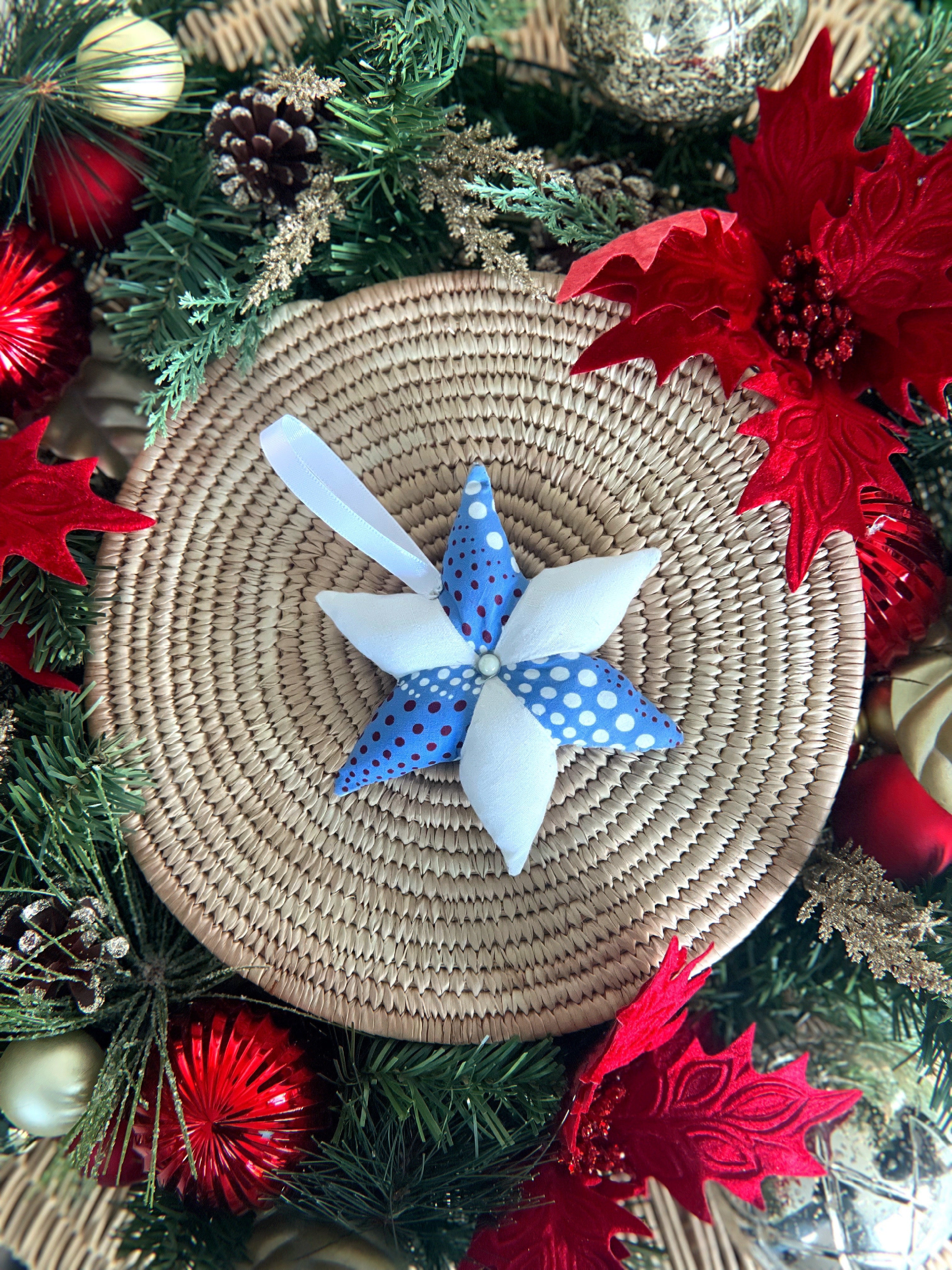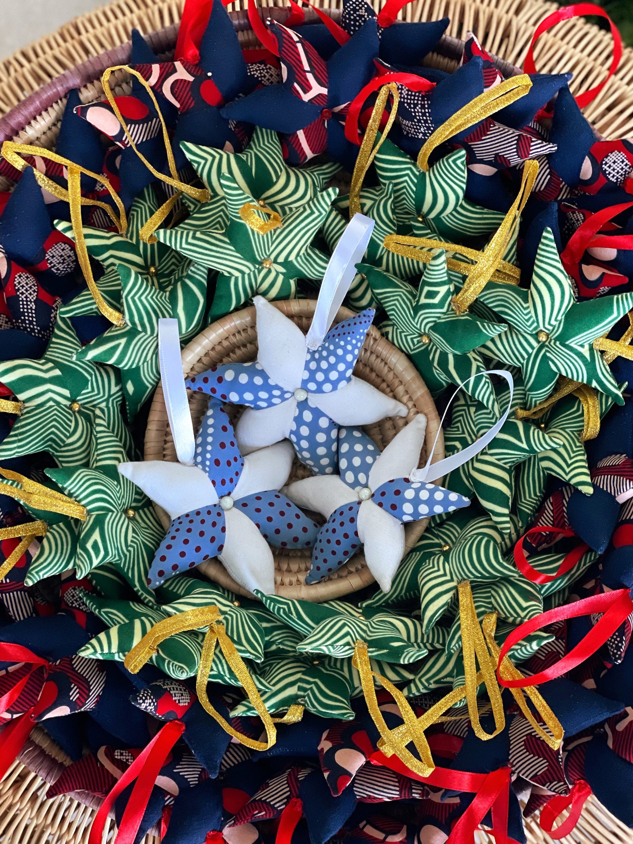 Our Icy Blue dot Superstar ornaments are handmade by Kamso Artisans using solar energy for a more sustainable Christmas decoration. The Blue dot fabric off cuts paired with the white fabric will have your tree  transformed into one from a winter wonderland!