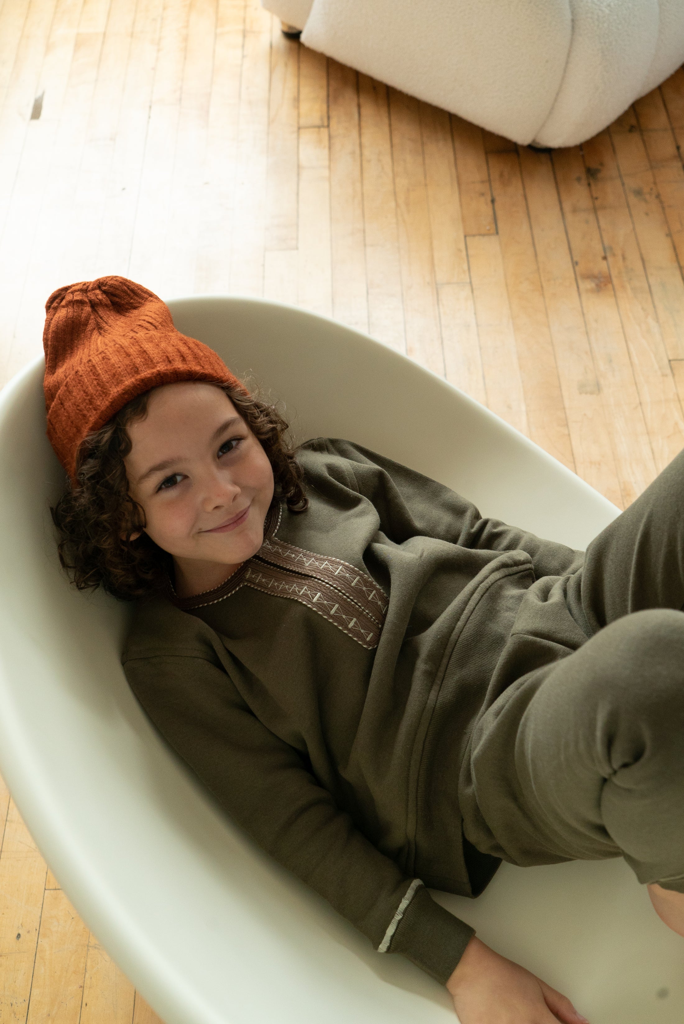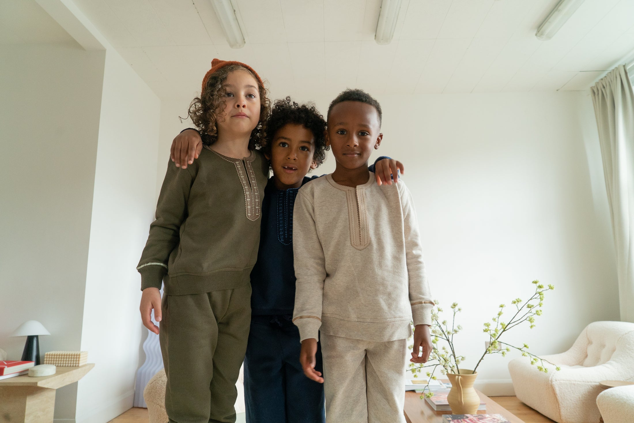 Our Olive embroidered tracksuit comprises of a jumper and tracksuit bottoms that have been freehand embroidered by our Nigerian artisans.